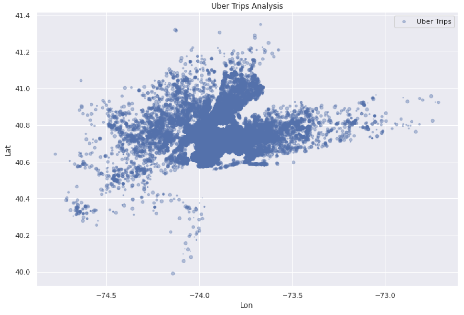 data.plot(kind='scatter', x='Lon', y='Lat', alpha=0.4, s=data['Day'], label='Uber Trips',